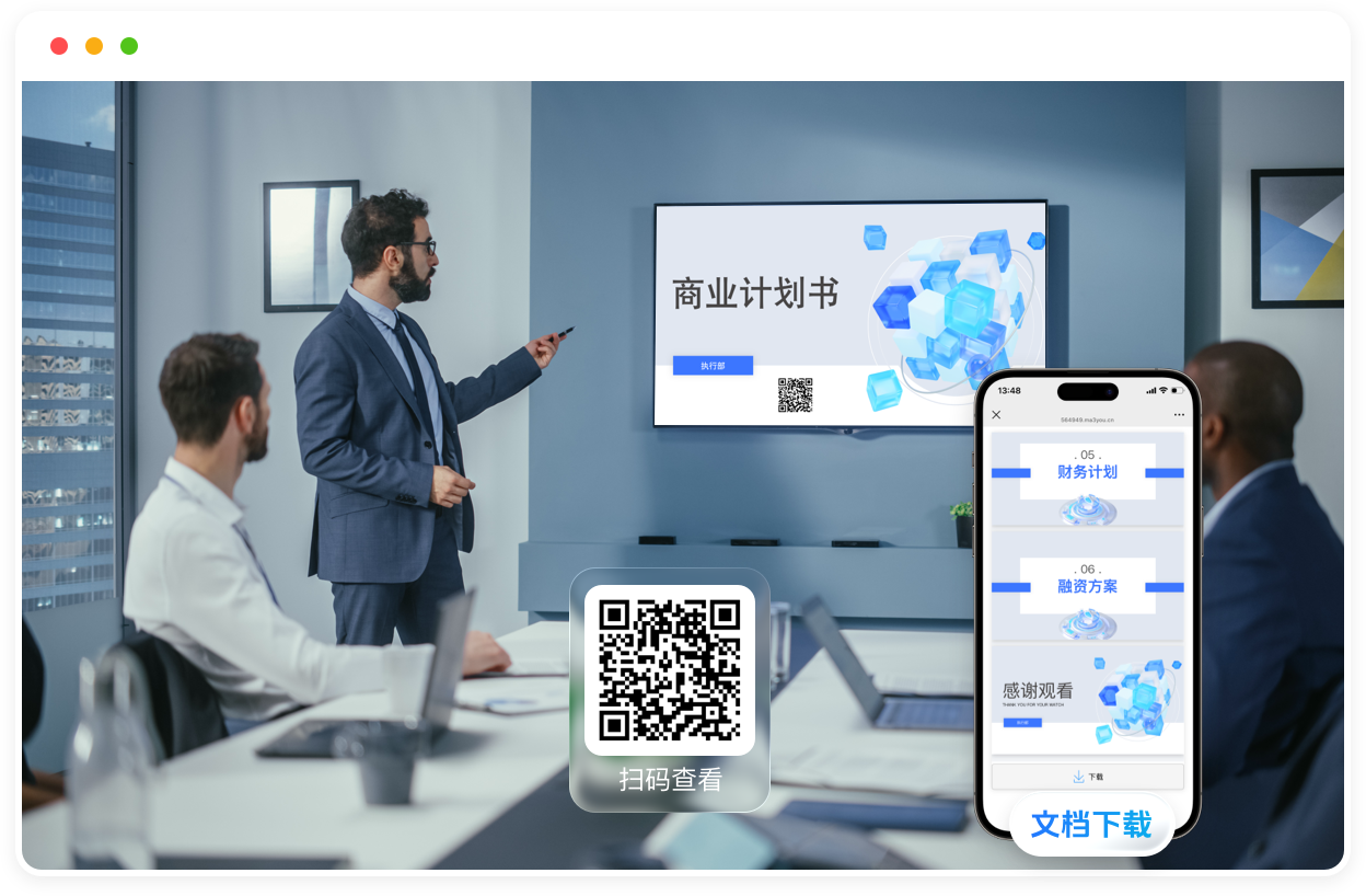 开会演讲时听众可以直接扫码观看或下载演讲文档,展会时通过一个二维码即可向用户传递产品介绍资料,替代纸制图册