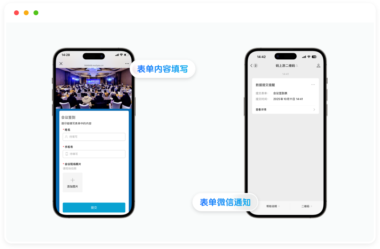 自定义表单内容,扫码即可填写快速搜集数据,适用于出入登记、课程预约、签到、报名和保修等